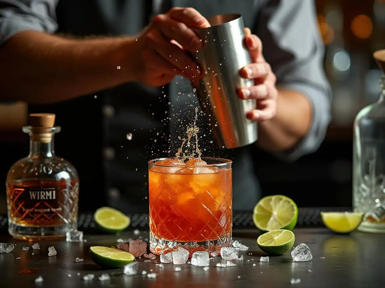 Dans un shaker, versez successivement 3 cl de rhum vieux jamaïcain, 3 cl de rhum agricole vieux de Martinique, 3 cl de jus de citron vert fraîchement pressé, 1,5 cl de curaçao orange, 1,5 cl de sirop d’orgeat et 0,5 cl de sirop de sucre de canne. Dosez avec un jigger pour une précision millimétrique, essence même d’un Mai Tai équilibré.