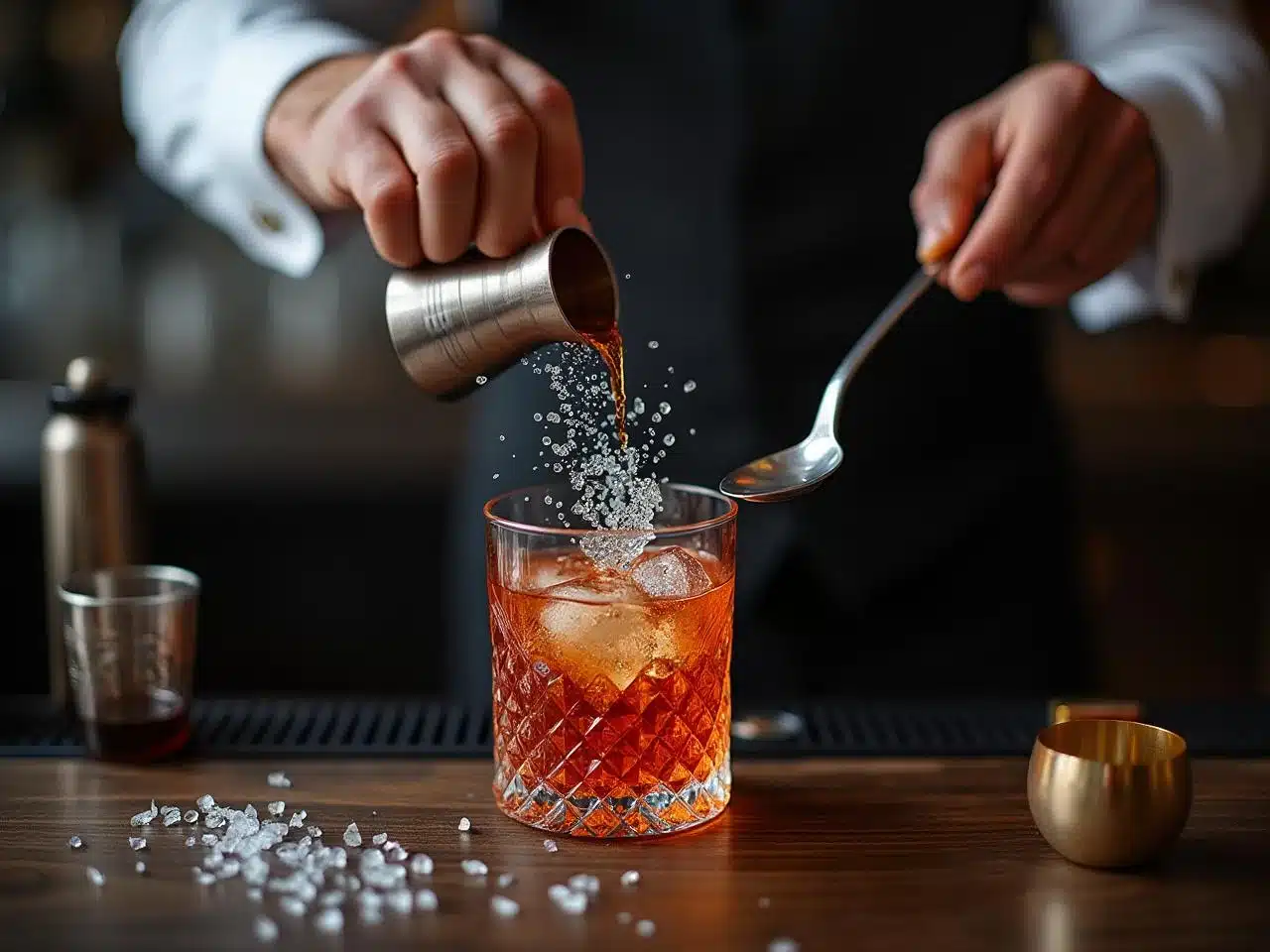 Ajoutez précisément 2 traits d’Angostura bitters. Les bitters rehaussent les notes épicées du rye et complexifient le vermouth, créant la signature aromatique du cocktail.
