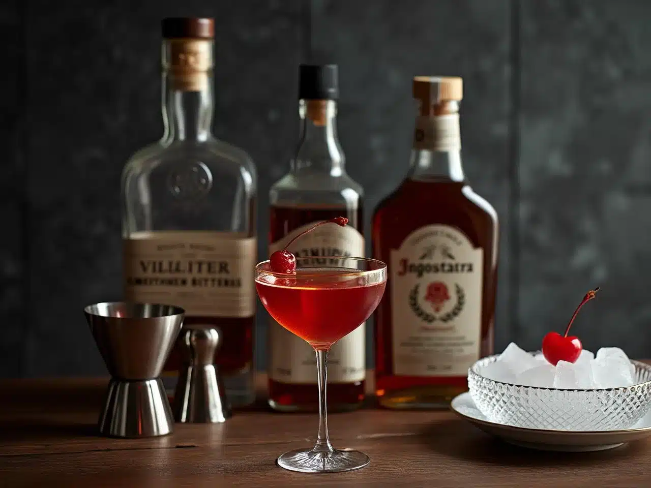 À l’aide d’un jigger, versez 60 ml de rye whiskey ou bourbon dans le verre à mélange refroidi, suivi de 30 ml de vermouth rouge doux. Assurez-vous de respecter les proportions pour l’équilibre aromatique classique du Manhattan.