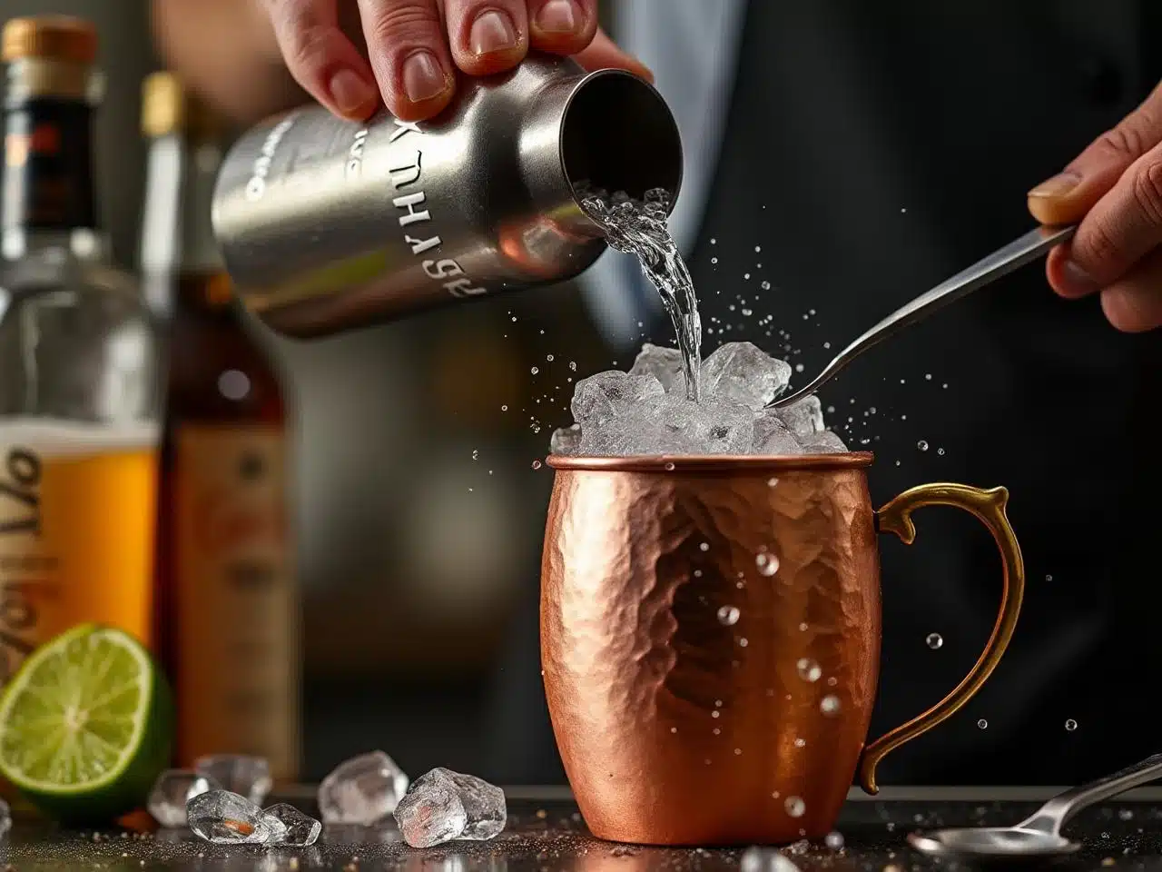 Placez un mug en cuivre ou un highball au congélateur quelques instants pour qu’il soit parfaitement glacé. Au moment du service, remplissez-le de glaçons jusqu’au rebord afin d’assurer une température constante du cocktail.