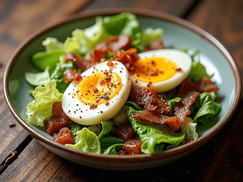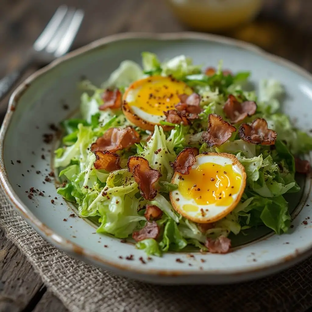 Servez immédiatement votre salade frisée aux lardons dans des assiettes individuelles. Bon appétit !