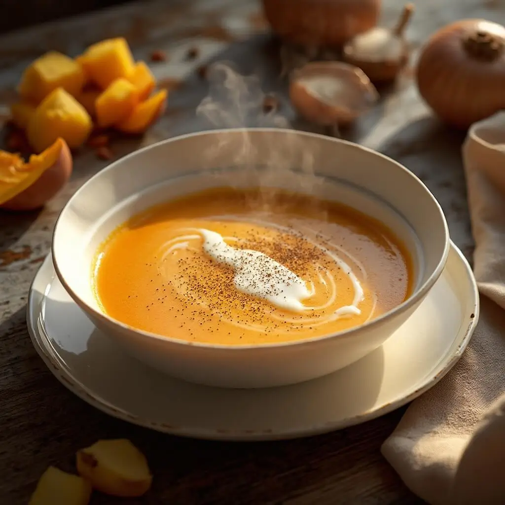 Servez le velouté bien chaud, éventuellement garni d’une cuillère supplémentaire de crème fraîche pour encore plus d’onctuosité.